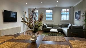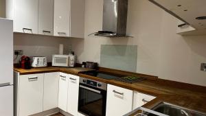 The fully equipped kitchen offers modern conveniences like a dishwasher, oven microwave combination appliances alongside kitchenware including coffee machine and electric kettle plus tea and coffee making facilities to support meal preparation needs comfortably during your stay. Additional room comforts include sofa seating areas suitable for relaxing or working thanks to a dedicated work desk along with wardrobe storage options, entertainment comes via flat-screen TV complete with streaming services access.