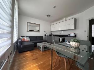This apartment features a private entrance leading to one living room and one separate bedroom with two beds. The bathroom includes a walk-in shower equipped with complimentary toiletries and a hairdryer. The fully equipped kitchen comes with an oven, stovetop, refrigerator, microwave, toaster and electric kettle alongside kitchenware and a dining table suitable for families using the provided high chair for children.