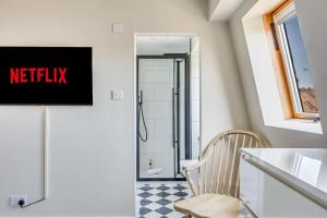The fully equipped kitchen boasts modern conveniences such as a stovetop, oven, dishwasher, refrigerator, microwave, coffee machine and electric kettle complemented by kitchenware for dining needs including a high chair for children. In-room amenities include work desks, ironing facilities with iron and board, washing machine with clothes drying rack plus bedside sockets connected to flat-screen TVs offering streaming services like Netflix.