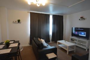 Guests can enjoy cooking meals in the fully equipped kitchen that offers an oven, microwave, refrigerator, toaster, electric kettle and all necessary kitchenware along with a dining table area. Entertainment options include a flat-screen TV with streaming services such as Netflix supported by free WiFi throughout the apartment. The building provides lift access to upper floors where the unit is located along with smoke detectors and carbon monoxide detectors for safety.