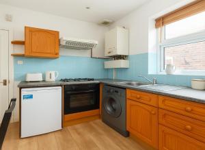 Die voll ausgestattete Küche verfügt über moderne Geräte wie Herdplatte, Backofen, Kühlschrank, Geschirrspüler, Mikrowelle, Toaster und Wasserkocher plus vollständiges Kochgeschirr. Ein Esstisch lädt zu gemeinsamen Mahlzeiten im Innenbereich ein. Unterhaltung bieten ein Flachbildfernseher mit Satellitenkanälen und Streamingdiensten einschließlich Netflix dank zuverlässigem Internetzugang im gesamten Apartmentgebäude. Express Check-in/Check-out Optionen erhöhen den Komfort zusätzlich.