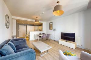 Accommodation comprises a separate bedroom with one bed, a fully equipped kitchen including an oven, stovetop, refrigerator, dishwasher, microwave, toaster, coffee machine and electric kettle as well as kitchenware for convenient dining preparation. The living area offers seating with a sofa alongside a flat-screen TV and work desk while the bathroom contains a shower and hairdryer. Additional in-room amenities include heating facilities, ironing equipment with iron and board, towels and bed linen as well as a washing machine.