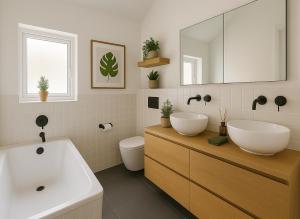 Accommodation features three bedrooms with a total of five beds across the unit, two bathrooms equipped with baths and complimentary toiletries, as well as a living room area furnished with a sofa bed and seating space. The fully equipped kitchen contains modern appliances such as an oven, stovetop, dishwasher, microwave, refrigerator, electric kettle, toaster and complete kitchenware to prepare your meals comfortably.