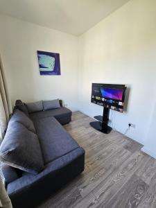 The kitchen is fully equipped for meal preparation featuring an oven, microwave, refrigerator, toaster, electric kettle as well as tea and coffee making facilities alongside kitchenware and a dining table. The living area has a sofa bed and flat-screen TV for entertainment while additional conveniences include carbon monoxide detector coverage.