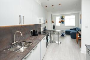 The apartment comprises one bedroom and one living room furnished with three beds including a sofa bed for flexible sleeping arrangements. Guests will find a fully equipped kitchen featuring a dishwasher, refrigerator, electric kettle, coffee machine, toaster and dining table to prepare meals comfortably. The bathroom contains a bathtub or shower along with complimentary toiletries such as shampoo, conditioner and body soap, additional conveniences include an iron, washing machine and clothes drying rack.