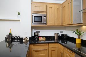 Inside the apartment are two separate bedrooms alongside one living room fitted with a flat-screen TV for entertainment. The fully equipped kitchen includes modern appliances such as a refrigerator, microwave, oven and dishwasher as well as tea and coffee making facilities to prepare meals comfortably.