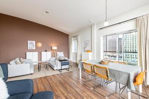 The spacious accommodation offers two bedrooms with two beds, complemented by two private bathrooms equipped with hairdryers. The fully equipped kitchen features modern appliances including an oven, dishwasher, stovetop, microwave, refrigerator, toaster, coffee machine and electric kettle as well as comprehensive kitchenware for your convenience. Additional room amenities include heating, wardrobe or closet space, towels and bed linen alongside ironing facilities such as an iron and ironing board plus a washing machine and work desk.