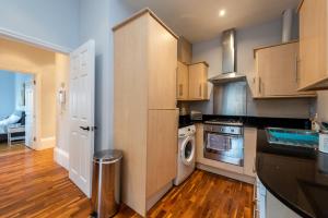 The full kitchen is outfitted with an oven, stovetop, microwave, toaster, refrigerator, and dishwasher to meet all cooking needs. Additional amenities include ironing facilities featuring an iron and ironing board as well as a washing machine to assist longer stays.
