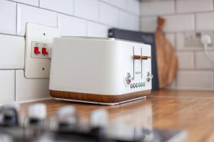 Accommodation comprises one bedroom with one bed, along with a fully equipped kitchen featuring an oven, stovetop, microwave, toaster and complete kitchenware set. The living space includes air conditioning, heating, a seating area with a sofa and flat-screen TV for entertainment.