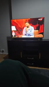 Le logement dispose de deux chambres séparées ainsi qu’un salon équipé d’une télévision écran plat et d’un coin salon. La cuisine entièrement aménagée comprend un four, un micro-ondes, une plaque de cuisson, un réfrigérateur et un grille-pain ainsi qu’une table pour les repas dans l’appartement.