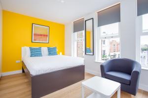 Accommodation options include open-plan studios and one-bedroom apartments featuring private kitchenettes equipped with a microwave, stovetop, refrigerator, coffee machine, electric kettle, dining table and full kitchenware sets. Each unit has a UK standard double bed measuring 135 cm by 190 cm along with underfloor heating but no air conditioning. In-room extras consist of seating areas with sofas or chairs, wardrobes or closets for storage, irons for convenience as well as linens such as bed linen and towels.