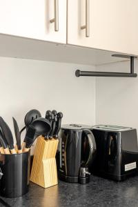 Guests benefit from complimentary toiletries in the bathroom featuring both walk-in shower facilities without steps plus an additional toilet alongside shampoo, conditioner and body soap supplies. Entertainment includes a flat-screen TV offering streaming services supported by free WiFi available across all areas of the apartment. Safety measures include smoke detectors and fire extinguishers inside the unit.