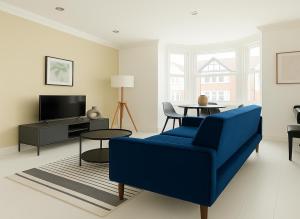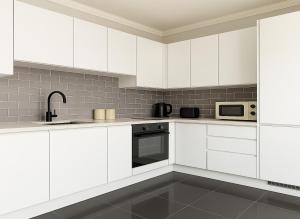 Accommodation comprises two separate bedrooms alongside a living room featuring a sofa bed and seating area with a flat-screen TV equipped with streaming services and satellite channels. The fully equipped kitchen offers an oven, stovetop, microwave, dishwasher, refrigerator as well as kitchenware including toaster and electric kettle for convenient dining experiences.