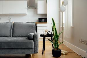 This contemporary one-bedroom apartment features a separate bedroom alongside a living room equipped with a sofa bed and flat-screen TV for entertainment comfort. The fully equipped kitchen includes essentials such as a refrigerator, microwave, dining table, and full kitchen facilities suitable for meal preparation and storage needs. The bathroom has either a bathtub or shower along with private toilet amenities.