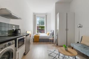 Inside the apartment, guests will find one bedroom furnished with one bed as well as a wardrobe for storage needs. The living space includes a sofa seating area and a dining table adjacent to the kitchen facilities such as stovetop and refrigerator. The bathroom comes with either a bathtub or shower along with essentials like towels, body soap, hairdryer and toilet.
