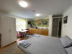 The accommodation comprises one bedroom furnished with non-feather synthetic pillows and bed linen along with heating for added comfort. Guests can enjoy a fully equipped kitchen featuring a stovetop, refrigerator, microwave, toaster, electric kettle and kitchenware alongside a dining table where meals may be served. The bathroom includes a shower with shampoo and body soap provided plus towels and toiletries are supplied to ensure convenience during your stay.