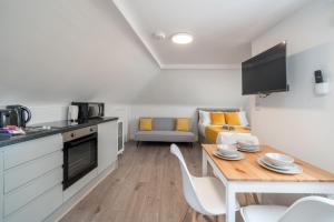 The studio apartment features two beds including a sofa bed, complemented by a fully equipped kitchenette boasting an oven, microwave, stovetop, refrigerator and kitchenware for convenient self-catering stays. Additional room amenities include bed linen, towels, heating, an iron with clothes drying rack as well as a washing machine for added practicality.
