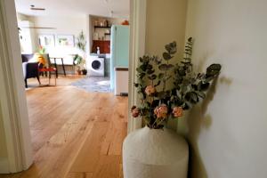 Boasting two bedrooms and one bathroom with a walk-in shower, this apartment features a fully equipped kitchen complete with an oven, stovetop, dishwasher, microwave, refrigerator, coffee machine and toaster among other amenities. The living area includes a flat-screen TV with streaming services as well as heating and ironing facilities for added convenience.