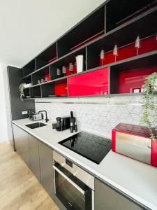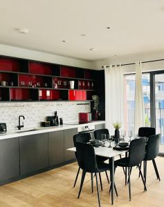 The spacious accommodation comprises two bedrooms, a living room with a sofa bed, and two bathrooms equipped with bathtubs or showers alongside complimentary toiletries such as shampoo, conditioner, body soap, and hairdryer. The fully equipped kitchen features modern appliances including an oven, stovetop, refrigerator, dishwasher, microwave, toaster, coffee machine as well as tea and coffee making facilities.