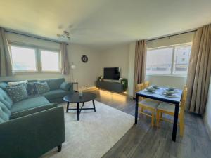 Inside the apartment, guests will find two separate bedrooms along with a living room that features a sofa bed and seating area. The bathroom offers modern amenities including a walk-in shower without steps, bidet, bathtub or shower options, hairdryer, body soap, conditioner shampoo as well as toilet facilities. The kitchen is fully equipped with an oven, stovetop microwave toaster refrigerator electric kettle tea and coffee making facilities plus dining table for enjoying meals.