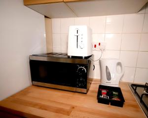 The kitchen area comes fully stocked with modern appliances including an oven, stovetop, refrigerator, dishwasher, microwave, toaster electric kettle coffee machine as well as kitchenware to prepare meals comfortably during your stay. Additional room comforts consist of heating facilities wardrobe closet trouser press ironing board iron washing machine towels sofa seating area bedside sockets along with smoke detectors and carbon monoxide detector ensuring guest safety.