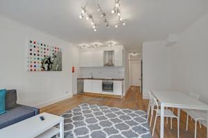 The apartment comprises one living room with a sofa bed and flat-screen TV alongside a separate bedroom featuring two beds for flexible sleeping arrangements. Guests benefit from a fully equipped kitchen including stovetop, oven, dishwasher, refrigerator, toaster, electric kettle and complete kitchenware set to prepare meals with ease. Additional in-room amenities include heating, hardwood flooring throughout, an iron with ironing facilities, clothes drying rack and wardrobe space.