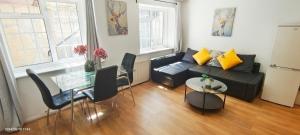 Accommodation comprises two separate bedrooms and a living room equipped with a flat-screen TV and sofa bed for added comfort. The fully equipped kitchen includes an oven, stovetop, refrigerator, microwave, toaster, coffee machine, electric kettle and all necessary kitchenware alongside a dining table to enjoy meals indoors.
