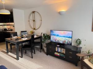 This soundproofed apartment comprises one bedroom with two beds, a separate living room, and one bathroom equipped with a bathtub or shower along with complimentary toiletries including shampoo, conditioner, body soap, and a hairdryer. The fully fitted kitchen comes complete with an oven, stovetop, refrigerator, dishwasher, microwave toaster as well as tea and coffee making facilities paired with kitchenware and dining table for convenience.