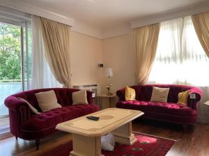 Accommodation includes three bedrooms furnished with four beds in total alongside two bathrooms featuring both a bathtub and shower as well as bidet facilities. Guests will find a fully equipped kitchen complete with an oven, microwave, toaster, refrigerator, electric kettle and dining table for meal preparation or casual dining moments. Additional room amenities comprise bed linens, towels provided for comfort, heating, non-feather synthetic pillows, wardrobe/closet space, seating area with sofa, washing machine, satellite flat-screen TV for entertainment.