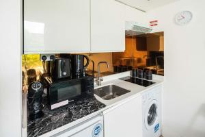 This one-bedroom apartment includes a fully equipped kitchen with a stovetop, refrigerator, microwave, toaster, coffee machine and electric kettle alongside tea and coffee making facilities plus a dining table for meals. The accommodation offers heating along with ironing facilities comprising an iron and ironing board, a work desk, wardrobe or closet space, towels and bed linen. A washing machine is provided for added convenience.