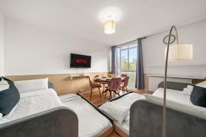 Inside the apartment, guests will find a fully equipped kitchen suitable for cooking and food storage along with one bathroom to accommodate up to seven people comfortably. Additional room features include heating to ensure warmth during cooler days, a flat-screen TV for entertainment, and baby cot or crib facilities.