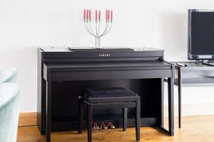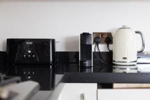 The fully equipped kitchen boasts modern appliances such as an oven, stovetop, refrigerator, dishwasher, microwave, coffee machine and toaster alongside ample kitchenware for dining convenience. Additional amenities include heating facilities, iron with ironing board clothes drying rack wardrobe closet washing machine private entrance smoke detector carbon monoxide detector lift access to upper floors flat-screen TV offering streaming services bedside sockets free WiFi throughout all areas.