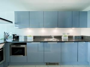 The accommodation consists of two bedrooms with three beds in total, along with two bathrooms equipped with bathtubs and complimentary toiletries including body soap, shampoo and conditioner as well as hairdryers for guest convenience. The fully equipped kitchen boasts modern appliances such as an oven, refrigerator, microwave, dishwasher and electric kettle complemented by tea and coffee making facilities plus kitchenware to prepare meals comfortably.