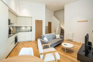 Inside this modern apartment guests will find two separate bedrooms along with two bathrooms featuring both bathtubs and showers as well as complimentary toiletries and hairdryers for convenience. The kitchen area comes fully equipped with an oven, stovetop, dishwasher, microwave, toaster, electric kettle and full kitchenware to prepare meals comfortably alongside a dining table for shared meals or gatherings.