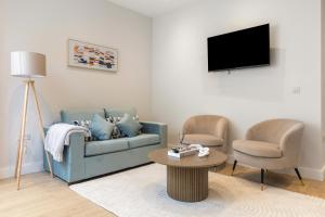 The accommodation includes two separate bedrooms alongside a living room, offering five beds in total including a sofa bed and rollaway bed for extra guests. The fully equipped kitchen features modern appliances such as an oven, stovetop, microwave, dishwasher, refrigerator, coffee machine, electric kettle as well as tea and coffee making facilities. Two bathrooms come complete with bathtubs or showers, complimentary toiletries including shampoo and conditioner, body soap and hairdryer.
