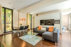 The accommodation includes one bedroom with two beds, a living room area, and one bathroom equipped with a hairdryer. The fully equipped kitchen boasts an oven, stovetop, refrigerator, dishwasher, microwave, toaster, electric kettle as well as all necessary kitchenware. Additional in-room amenities include a flat-screen TV with streaming services and satellite channels, ironing facilities with iron and ironing board, washing machine, sofa bed seating area with work desk and bedside sockets for convenience.