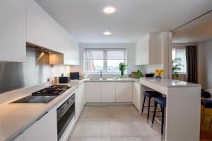 Each apartment features one or multiple bedrooms with beds ranging from one up to five per unit, along with private bathrooms equipped with bidets, walk-in showers or bathtubs, bathrobes, slippers and complimentary toiletries. Living rooms include sofas and flat-screen TVs offering satellite channels and streaming services like Netflix. Kitchens are fully equipped with appliances such as dishwashers, washing machines, ovens, stovetops, microwaves and coffee machines alongside dining tables.