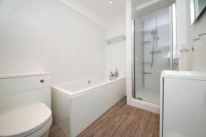 Inside, guests will find two beds spread across the bedroom and living room sofa bed. The accommodation includes an equipped kitchen boasting an oven, stovetop, refrigerator, dishwasher, microwave as well as coffee machine and electric kettle for convenience. A dining table complements the full kitchen setup where cookware and utensils are provided. The bathroom features both a walk-in shower with no step access and a bathtub along with complimentary toiletries including shampoo, conditioner, body soap and slippers.
