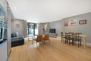 Each apartment comprises one living room with seating area featuring a sofa and flat-screen TV, one or two separate bedrooms with two beds per unit, and a private bathroom equipped with complimentary toiletries including shampoo and body soap as well as either a bath or shower. Kitchens are fully equipped with stovetop, refrigerator, dishwasher, oven, microwave, toaster, coffee machine, electric kettle and kitchenware accompanied by dining tables. Additional room amenities include washing machines with clothes drying racks available in all units along with ironing facilities and work desks.