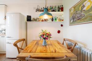 This two-bedroom apartment features a living room equipped with a television as well as sofa seating including a sofa bed. The fully fitted kitchen offers an oven, stovetop, dishwasher, refrigerator, microwave, coffee machine, electric kettle, toaster and tea and coffee making facilities alongside a dining table for meals.