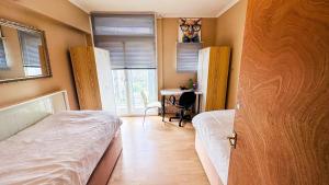 Each room includes one or two beds with shared bathrooms featuring a bath or shower, hairdryer, and complimentary toiletries. Guests benefit from fully equipped kitchens containing a microwave, refrigerator, electric kettle and kitchenware as well as dining tables. Other in-room amenities consist of heating, washing machines, wardrobes or closets, work desks and irons.