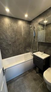 The apartment comprises two separate bedrooms along with a living room furnished with a sofa bed and flat-screen TV. Guests will find two bathrooms featuring bathtubs or showers as well as complimentary toiletries including shampoo, conditioner, body soap and hairdryer. The fully equipped kitchen contains a stovetop, oven, microwave, refrigerator, dishwasher and kitchenware alongside tea and coffee making facilities plus an electric kettle for added convenience.