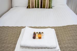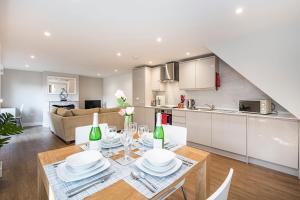 Accommodation comprises two separate bedrooms alongside one living room and two bathrooms equipped with walk-in showers and complimentary toiletries including shampoo, conditioner, body soap, and hairdryer. The fully equipped kitchen contains modern appliances such as a refrigerator, dishwasher, oven, microwave, toaster, electric kettle as well as kitchenware and tea and coffee making facilities.