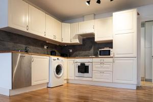 Accommodation comprises two separate bedrooms plus one living room featuring parquet flooring throughout for added warmth and style. The bathroom contains both a bathtub and shower along with a hairdryer and private toilet facilities. Guests can enjoy entertainment on the flat-screen TV with streaming services in the seating area or prepare meals in the full kitchen fitted with an oven, stovetop, dishwasher, microwave, toaster, refrigerator, electric kettle, kitchenware and dining table.