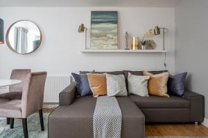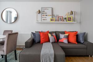 The apartment features two bedrooms with en-suite bathrooms equipped with walk-in showers and complimentary toiletries including shampoo and conditioner. Guests will enjoy a living room furnished with a large sofa, flat-screen TV with satellite channels, as well as hardwood flooring throughout some areas. The fully equipped kitchen includes a dishwasher, oven, stovetop, microwave, toaster, refrigerator and electric kettle alongside tea and coffee making facilities to meet all dining needs.