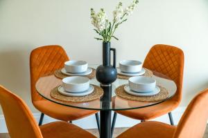 The accommodation comprises two separate bedrooms alongside a living room furnished with a flat-screen TV featuring streaming services. The fully equipped kitchen contains an oven, stovetop, dishwasher, microwave, refrigerator, toaster, electric kettle and all necessary kitchenware plus a dining table. Guests will find one bathroom fitted with a shower, hairdryer and complimentary toiletries including conditioner and shampoo.