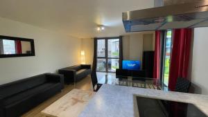 The accommodation comprises two bedrooms alongside a living room furnished with a sofa and flat-screen TV. The fully equipped kitchen features an oven, stovetop, refrigerator, dishwasher and all necessary kitchenware including tea and coffee making facilities as well as a microwave and toaster. Both bathrooms include bathtubs or showers plus complimentary toiletries such as shampoo, conditioner, body soap and hairdryer. Additional in-room amenities encompass heating, soundproofing for privacy, ironing facilities including iron and board, wardrobe space, bedside sockets as well as hardwood flooring complemented by carpeted areas.