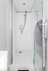 Die Unterkunft verfügt über ein separates Schlafzimmer mit Parkettboden und schallisolierten Wänden sowie ein Badezimmer mit begehbarer Dusche und Haartrockner. Zur Ausstattung gehören Bettwäsche und Handtücher sowie Annehmlichkeiten wie Bügeleisen und Bügelbrett, Kleiderschrank oder Schrankfläche, Heizungssystem, Feder- und Synthetikkissen für Komfort sowie Steckdosen am Nachttisch. Ein Flachbildfernseher mit Satellitenkanälen ist ebenfalls vorhanden.