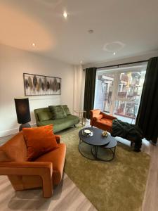 В апартаментах две спальни с тремя кроватями и два санузла с ваннами и душевыми кабинами. Полностью оборудованная кухня включает плиту, холодильник, посудомоечную машину, духовой шкаф, микроволновую печь, кофемашину, тостер и электрический чайник вместе с необходимой посудой для самостоятельного приготовления пищи. Дополнительные удобства включают отопление, утюг, шкафы для одежды, зону отдыха с раскладным диваном, стиральную машину с сушильной функцией, постельное белье и полотенца.