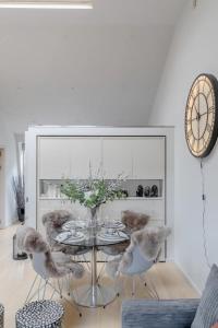 Inside the apartment, guests will find one bedroom furnished with one bed and an adjoining private bathroom equipped with a bathtub and complimentary toiletries including shampoo, body soap, and hairdryer. The fully equipped kitchen features an oven, stovetop, refrigerator, microwave, dishwasher as well as kitchenware for meal preparation alongside an electric kettle and toaster. Additional conveniences include a washing machine, tumble dryer for clothes drying needs, dining table area heating provisions along with towels and bed linen supplied.